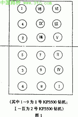 钻孔时应避免两部钻机在相邻孔位同时操作,每部钻机完成钻孔后要隔一个孔就位,钻孔顺序如图1所示。