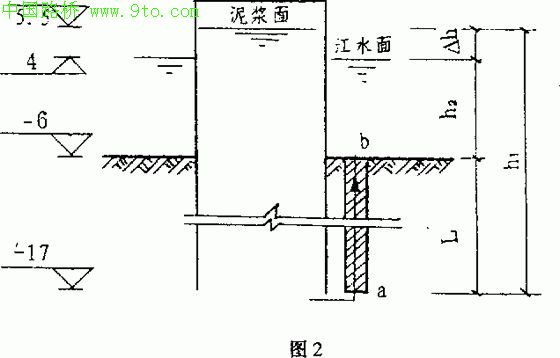 穿孔是北汊桥钻孔施工中出现较多的事故,穿孔实际上是一种管涌现象,现分析如下:如图2所示,设L为护简埋深,h1为泥浆顶至护简底深度,h2为水深,Δh为水头高度。穿孔时泥浆从护筒底垂直向上穿出,如图中箭头所示。切取护筒底至