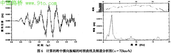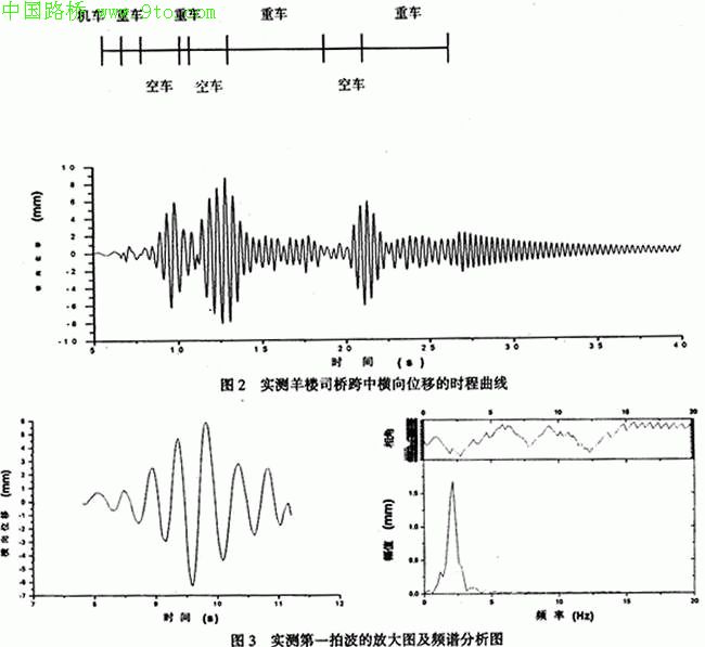 大量的实桥实验表明阳一副,引起小跨度上承式简支钢板梁产生较大横向振动是在空载或轻载货车以 60km/h~80km/h速度通过这一特定车况和速度下发生的普遍现象,而相同速度下的重载货车、机车和更高速度的客车通过时则没有出现这一现象,结合实测的桥梁横向振动波形,可以说明,这种横向振幅过大的原因是车辆运动的横向作用频率(如轮对蛇行运动)与桥梁有载横向振动频率相近时激发的谐振。实测中还发现,在这种特定车况和速度下部分小跨度PCT梁和下承式简支钢板梁也出现较大的横向振动。