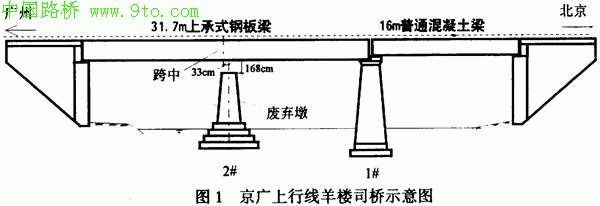 本论文在研究车桥横向柏振时的研究对象是三节C62A空货车以72km小的速度通过羊楼司桥。该桥位于京广上行线,直线,平坡,由1孔31.75m上承式铆接钢板梁和1孔普通钢筋混凝土梁组成,如图1所示。