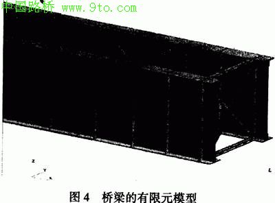 桥梁有限元模型的建立是按学楼司桥的实际尺寸建模,如图4所示。计算模型中将腹板考虑为板单元,翼缘及各竖向加劲肋为梁单元,横联和平联为杆单元,腹板及加劲助、横联、平联的尺寸及空间位置都采用实际角钢截面尺寸,各单元之间由节点连接,节点处的位移满足变形协调条件,支座采用单点约束的位移条件。