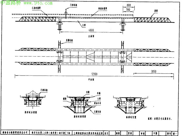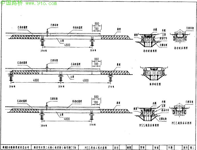 本桥引进挪威NRS公司设计的下承式移动支撑系统。中交公路规划设计院根据支撑模板系统的特点对箱梁进行了修改设计。该系统在南京二桥创造了单跨支架9天一孔的施工记录,节约了施工成本。