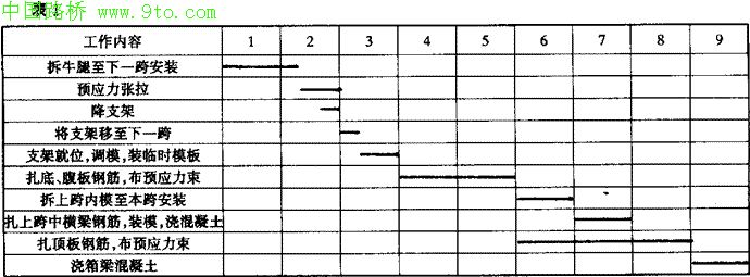该桥由于设计要求必须待上跨中横梁混凝土强度到达80%后方可浇注本跨梁混凝土,受中横梁混凝土强度控制,目前正常进度为9天/跨,施工周期如表1。