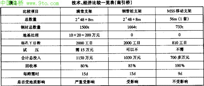 南京长江二桥处于长江中下游地区,地质复杂,地表为承载力极差的淤泥质亚粘土,对于满堂支架来说,地基处理便是个大问题,且有一跨为跨大堤施工,一为跨小河沟施工。按照原方案,为确保工期,是投入二跨满堂支架及一跨钢管桩支架,两套模板,加上地基处理,需投入1200多万元,且劳动强度大,速度慢,需大量人工等。而一套移动支撑系统仅需700