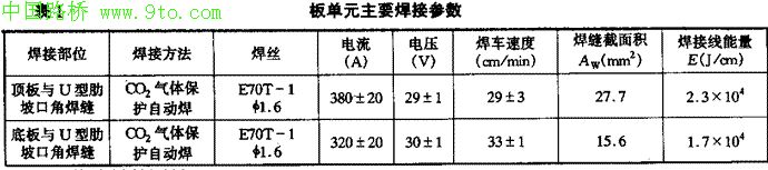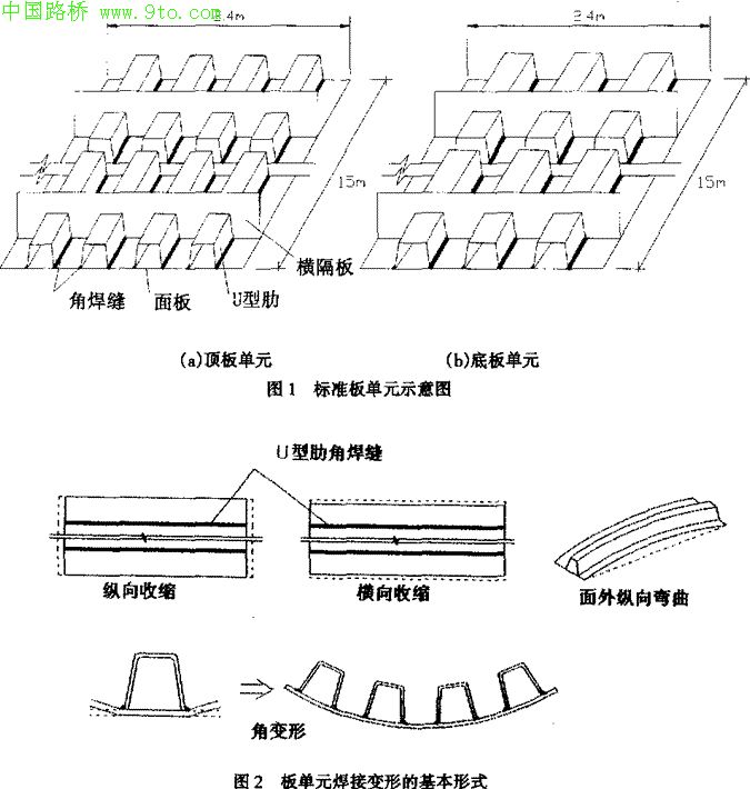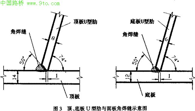 顶板标准单元的面板厚14mm,上面焊4个壁厚8mm的纵向U型助;底板标准单元的面板厚