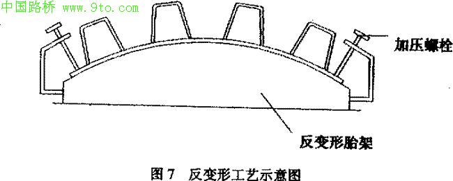 根据大量的试验结果,初步确定了顶、底板预加的反向角变形量,再根据生产实践进行改进,设计了专用的反变形焊接胎架进行U型肋的焊接,如图7所示。