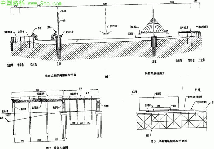 2000年4月~5月,这个时期长江水位较低,且这个区域河床较高,属于边跨浅水区,运梁船将无法靠近,同时,河滩上辅助跨钢箱梁块件也需要采用一定方式安装到位。所以,对于浅水区和辅助跨的这一部分岸侧钢箱梁,采用了在临时墩至辅助撤的边跨浅水区及辅助跨范围搭设排架,并通过浮吊吊装及在排架上移梁的方法使钢箱梁预先存放到位。其中,边跨钢箱梁块件仍采用桥面吊机悬拼安装,而辅助跨钢箱梁块件则在排架上精确定位拼装,等待与边跨悬拼过来的钢箱梁拼装合龙。主梁安装总体方案见图1。