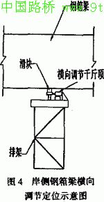 钢箱梁块件滑移到位后,在横向设置千斤顶,采用顶滑块的方式,调整钢箱梁平面位置(见图4);在滑轨上设置扁顶(高10cm)落梁,进行箱梁标高调整。精确定位后的钢箱梁支承在永久支座或滑轨与梁底之间的钢楔块上。作为基准件的过渡墩上的钢梁块件,采用对钢箱梁纵轴线上前后两点及与纵轴线垂直的根基线上的左右侧两点进行共同控制的定位方法,在较短时间内即精确地完成了定位工作。