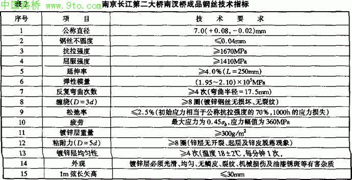 制造斜拉索的钢丝的尺寸、外形、重量、力学性能以及化学成分的要求应符合《桥梁缆索用热镀锌钢丝》(GB/T17101-1997)的规定,在交货的成品钢丝中,不得有任何形式的接头。南京长江第二大桥南汊桥成品钢丝技术指标详见表2。