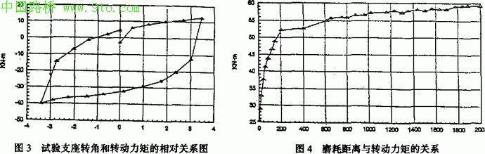0.5Hz。反复加载直到支座盆塞与盆环的相对运动距离累计达到2000m。在试验过程中连续记录转动力矩、转动角和临近黄铜紧箍圈处的钢盆温度。达到要求的磨耗次数后,取出试件,检查承压橡胶是否从钢盆中挤出,测量黄铜紧箍圈确定磨耗程度,并记录试验期间恢复力矩的上升值和钢盆温度的变化情况。