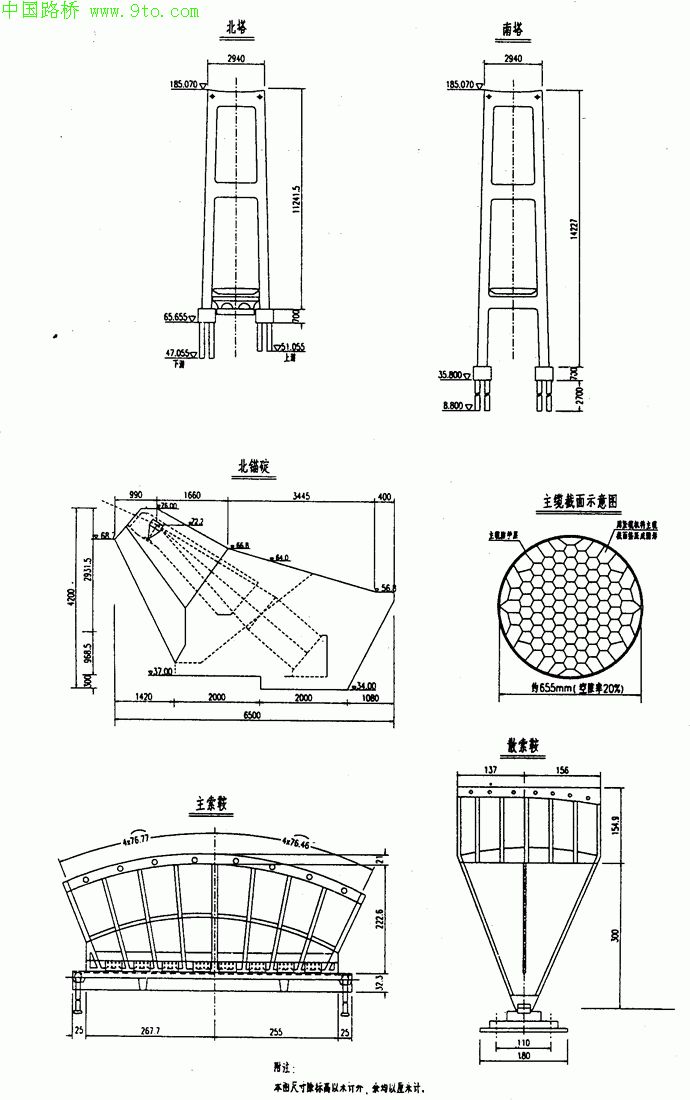 塔身及横梁为50号混凝土,承台为30号混凝土,桩基为25号混凝土。全桥桥塔50号混凝土10554立方米,30号混凝土4867立方米,25号混凝土4768立方米。
