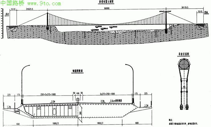 悬索桥主跨跨度为960m,主梁简支在两侧桥塔横梁或交界墩承台上。主桥南岸通过三孔30m简支梁桥同南岸互通工程相接,北岸通过跨度为16,20,25(m)空心板组合的引桥跨318国道、接北岸接线工程。主桥桥梁全长1206m。