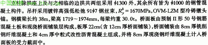 采用中承式双肋悬链线无铰拱,矢跨比1/4.5。每肋由6φ750钢管混凝土组成,由横向平联板、腹杆连接成为钢管混凝土桁架,这种截面布置具有较大的单肋刚度可以适应转体。大节段吊装等施工方法,对特大跨度拱桥具有较好的经济性。沿拱轴采用变高度(拱脚钢管中心距8.039m,拱顶钢管中心距4.00m、等宽度(3.45m)截面,两肋中心距35.95m,共设置6组"米"字、2组"K"字横撑。在拱助的弦管和平联板内灌注50号高强混凝土,腹杆和横撑钢管内则不灌混凝土。为了便于转体施工,两组"K"撑置于拱顶。