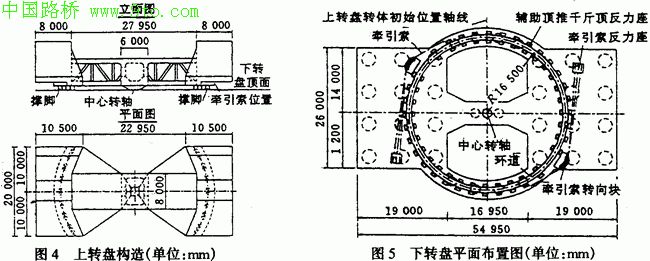 下转盘由环道、牵引体系、中心转轴等组成(见图5),为保证环道的平整度、光洁度,施工时将预埋环道顶面钢板的颈性骨架,用螺栓连接钢板与颈性骨架,精确调平后再灌注钢板下混凝土。任意3m孤长环道的高差不大于1mm。
