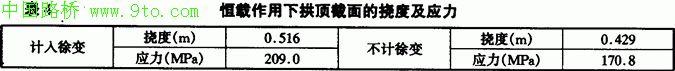 考虑钢管内混凝土的收缩、徐变后,拱顶的挠度增加,各截面铜管应力增大、混凝土应力减小(见表4)。
