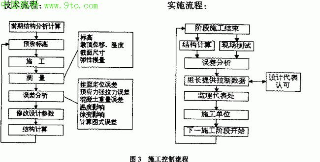 施工控制是一个预告→施工→量测→识别→修正→预告的循环过程,其流程如图3所示。其中技术流程是指理论计算的循环过程,实施流程是指参与施工控制的各协作单位的工作关系,下面主要讨论技术流程中的一些重要环节。