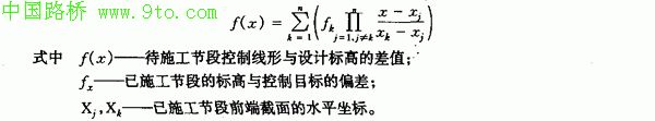 在施工过程中,由于结构实际情况与理论计算的差异以及挂篮定位标高放样的偏差,必将导致已建部分在成桥时呈现的线形曲线出现不能消除的误差。如果不顾及这种误差继续以后节段的施工,可以造成全桥的线形反折突然,波动较大。鉴于这种情况,须对未施工节段的控制线形作出修改。在本桥的施工控制中采用了拉格朗日差值法: