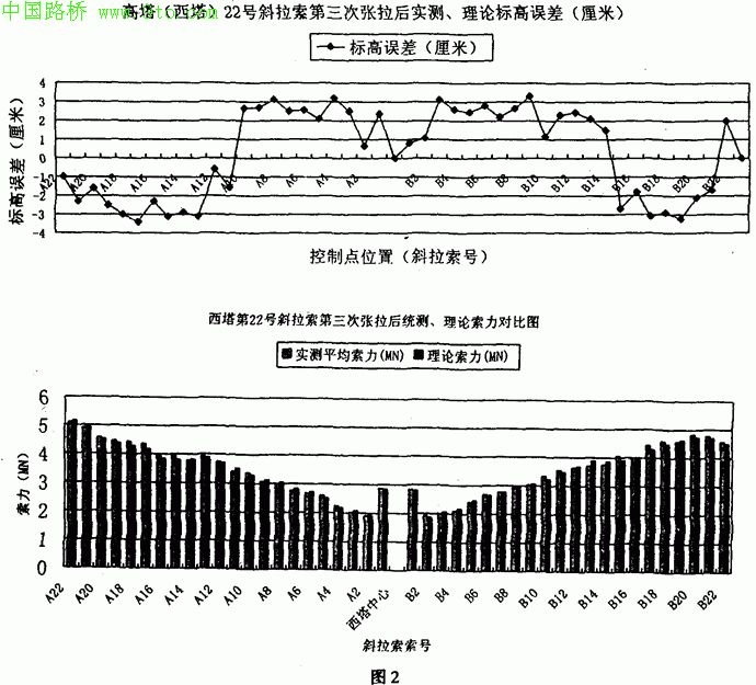 下面给出合龙前高塔完成22号索第三次张拉的结果,如图2,索力均住制在±5%以内,标高基本上都控制在±30mm以内。