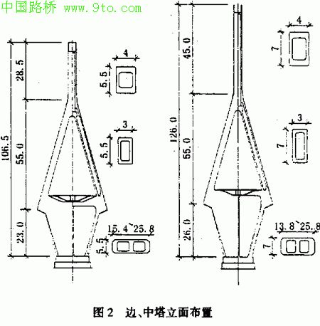 全桥3个主塔塔高不等,两边塔结构相同,中塔高于边塔。主塔采用钻石型钢筋混凝土结构,边、中塔自承台顶以上高度分别为106.5m,126.0m。塔身均为单箱单室或单箱双室截面。
