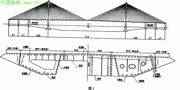 礐石大桥是一座主桥为7跨连续公路混合加劲梁斜拉桥,跨长分为2*47m(PC箱梁)+[100m+518m+100m](钢箱梁)+2*47m(PC箱梁),钢箱梁全长718m,纵向分为63个节段,标准节段12m,横向宽30.35m,分为两个分离式五边形单箱、两个三角体风嘴和一个纵横肋构成的正交异性结构桥面板五大部分,见图1。横向五大部分及节段纵向接口之间均采用高强螺栓连接。材料为日本产钢材SM490C全桥钢梁重9400t。