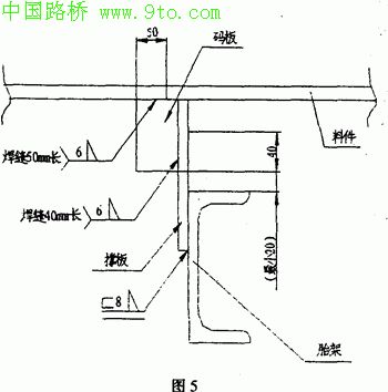 箱型的上盖板板单元按纵横基准线就位后,面板与胎架撑板之间密切并用码板焊连,见图5,撑板的上顶面起组装平台的作用,码板在纵、横向弹性约束焊接变形、弹性变形可削弱纵、横向焊接产生的内应力,但使板面与撑板之间保持密切在纵横向有强约束作用,箱型各种零部件组装焊接(部分焊缝翻身后施焊)后,箱型钢梁与胎架之间解除码板约束,其自身刚性可克服内应力引起的各种变形,从而控制了箱型的扭曲变形。