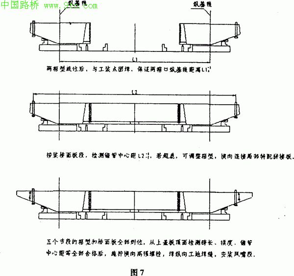 就位,测量下盖板支点处横向面高低差,用斜盖板支承点进行调整,用激光经纬仪以胎架线位找正上下盖板纵基线使其在一个垂直面内(当下盖板高低不平与箱口垂直度有矛盾时,相互勾借),箱梁与工装之间用码板点固。另一箱梁用同样的方法就位,但采用横向可动纵向不动的点困措施,待桥面板段组装到位检查钱管中心距无误后点固横向,组装程序见图人第二节段摆放时,箱梁的内外腹板用工艺拼装板把紧,内外腹板处的上下斜盖板外侧面保证平齐,相互勾借,下盖板面高低差及箱口垂直度均满足要求后与胎架点固焊。依次摆好五个节段,从上盖板顶面纵基线上的支点位置检测拱度值。
