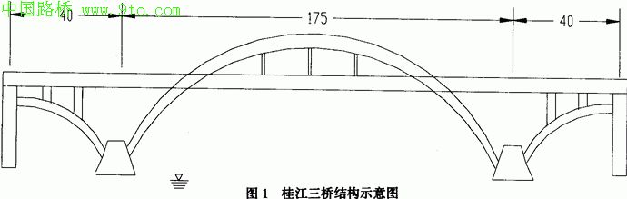 桂江三桥主桥为三孔自锚式钢管混凝土中承式系杆拱桥,主桥全长255m(40m+175m+40m),桥宽25.6m,桥型新颖、美观,与两岸桥头的鸳江春泛景点构成一幅靓丽的景观(见图1)。