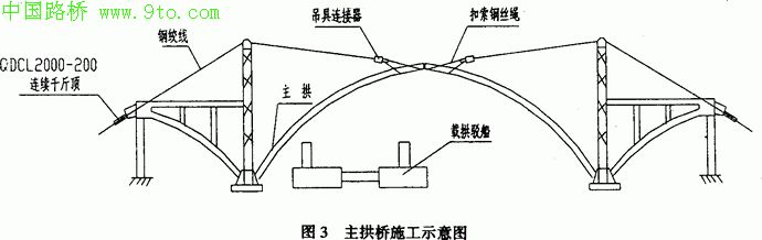 采用天线缆索吊装的方法是设计工程师原先拟采用的方法,原设计将主跨分5节段吊装合龙,每段吊装重约65t,由工厂预制水运到位,天线起吊,塔机定位,该方法的施工工艺比较成熟,但需要大跨度、大吨位的缆机,造价较高,且受桥尾场地所限。