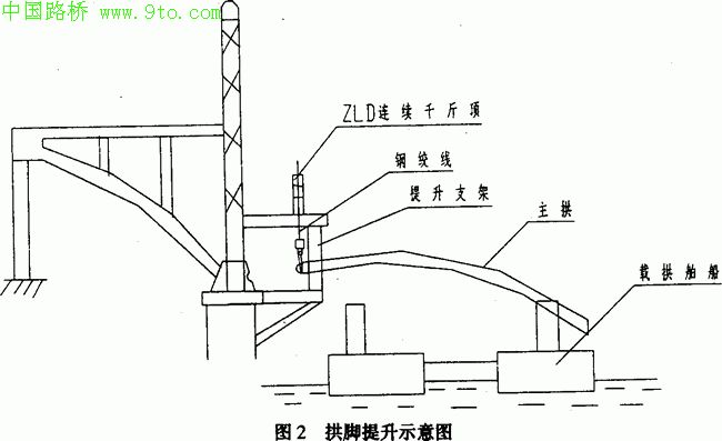 桂江三桥钢管拱肋液压竖向转体施工的总体方案是:先将主拱分成两个半拱在驳船上的胎架上焊接完成,经过对焊接质量、几何尺寸、拱轴线型等验收合格后,载拱驳船浮运至桥位,利用4台ZLD100提升千斤顶将半拱拱脚提升至标高,然后横移就位于拱铰座上,再由分别设置于两边拱的6台液压连续提升千斤顶,通过钢绞线,吊具将两个半拱肋竖向转体就位,在空中对接组焊合龙。施工中技术方案,见图2、图3所示。