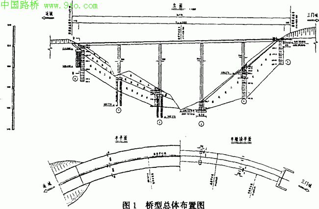 该桥的设计有如下几个特点:其一是预应力混凝土弯箱梁在设计难度较大的情况下,设置了斜腹板,导致了预应力钢束空间线形布设的难度更加繁复化。其二是该桥的桥面超高达5%,导致了内外腹板高差较大,增加了箱梁自身的扭矩。其三是该桥纵断面位于3%的纵坡内,使桥梁的构造处理进一步复杂化。其四是该桥跨越深谷,桥墩高度达66m,为了保证桥墩形状线条简洁,其外形尺寸保守一致,内侧腹板由上向下逐渐加厚。对以上诸条不利因素,在本次施工图设计中都得到了很好的解决。