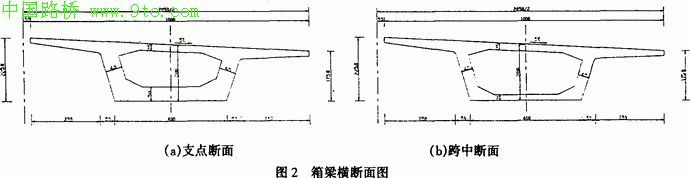 上部构造采用梁高为2m(以箱中心为准)的等截面斜腹板单箱单室预应力混凝土连续梁。桥梁横坡由两腹板调节而成。内侧(圆心侧)腹板高度为147.5cm,外侧腹板高度为172.5cm。单幅桥箱梁顶板宽度为10m,底板宽度为4.0m。悬臂板长度为2.5m。箱梁在跨中断面其顶、底板厚度分别为25cm和20cm。腹板宽度为40cm。lm过渡段之后,其腹加厚至60cm,余均不变。再过渡到底板厚50cm。边跨梁端顶、底板厚度分别为50cm及80cm。为了便于施工,在悬臂板与腹板的交接处设R=10cm的圆弧,以利于脱模。为增加桥梁的美观性,箱梁断面采用斜腹的形式(见图2)。