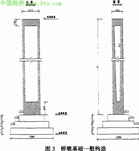 根据地质资料显示,桥位处沟谷两侧的基岩强度存较大差异,且存在一条死断层,运城岸基岩风化严重,且较软弱,所以,桥墩基础在运城岸采用钻孔灌注桩,双排桩桩径为150cm,承台厚200cm。三门峡岸基础采用钢筋混凝土扩大基础,分为三层,每层厚度1.5m,最下层平面尺寸为10m*9.7m的矩形,襟边宽度横桥向取为1m,顺桥向取为1.2m。