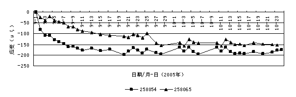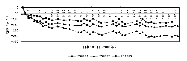 二次衬砌表面应变量测在拆模后马上进行,准备工作始于2005年8月下旬,量测工作从2005年9月1日开始,持续到10月23日(进入冬季,天太冷,现场停止大规模施工)。