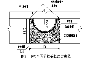 图5,采用PVC半圆管引水方案、在隧道现有接缝处凿开一个槽,尺寸为15cm(宽)×10.5cm(深),其他基本同塑料盲沟引水方案设置。