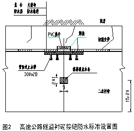 由于本路隧道建设时间较早,当时对高速公路隧道的特点研究不足,施工机械也较少,建设力量薄弱,是引起隧道病害的主因。由于施工力量弱,未采用大模板台车进行隧道衬砌,隧道接缝多。因为对高速公路隧道认识不足,也就没有足够认识到隧道防水的重要性,设计中未考虑隧道衬砌的防水设施,具体表现在隧道各模板衬砌接头未设置止水带,衬砌和围岩间也为设置防水板,如图1。目前正常情况下高速公路隧道衬砌接缝防水标准设置如图2,二衬与初期支护间设置防水层,接缝部位设置止水条和背贴式止水带,同时隧道要求采用大模板台车,各接头距离12m左右。