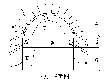 (5)、边墙部位支护钢架的锁定锚杆或锚管打设突出超前固结下方地层,有效的防止了中层和下断面开挖后边墙部位的坍塌,且减少了拱顶沉落量。