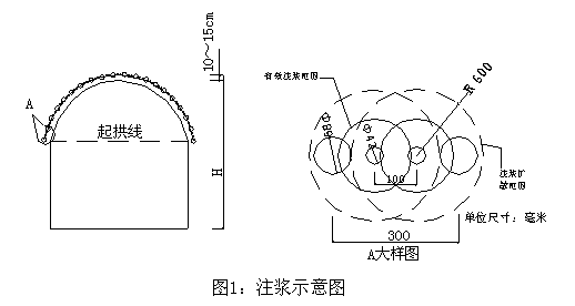双液浆利用管外混合方式,即两套管路各一套注水泥浆,另一套管路注水玻璃,从两侧向拱部注浆。