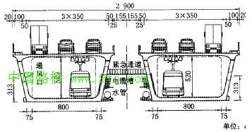 本桥为双层桥型,上层为双向6车道,中间有栏杆,两边有人行道和护栏,下层为双向4车道,另有2根?800mm的水管及7层电缆槽,还有通风系统、照明电力系统、消防安全及交通监控系统。为了使横桥向受力合理、施工简便,主桥横向设2个分离的单箱单室截面,每箱具体布置如下。上层:0.2m(护栏)+1.0m(人行道)+0.5m(路缘带)+3×3.5m(行车道)+0.5m(路缘带)+0.25m(防撞栏)=12.95m。下层:0.5m(路缘带)+3.5m(行车道)+4.0m(轻轨车道)=8m;或0.5m(路缘带)+2×3.5m(行车道)+0.5m(路缘带)=8m。为设置主跨斜拉桥塔柱,两箱之间间隙为3.1m,异型段后两箱梁之间间隙为0.1m。斜拉桥桥面宽为15.95m,主要是增加了斜拉索的锚固区。引桥箱梁及正桥斜拉桥的横断面具体布置见图2。