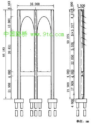 主塔柱顺桥向自上而下等宽,宽度为5.5m,横桥向均为3m。塔柱截面采用单箱单室。下横梁为单箱单室截面,高4.0m,宽4.0m,为了适应横梁端部受力需要,在横梁与塔柱交接处对横梁截面进行了局部加强。上横梁为单箱单室截面,横桥向梁底设椭圆线形。上、下横梁均为全预应力构件。斜拉索直接锚固于塔柱内壁的锯齿块上,为了平衡斜索在塔柱截面产生拉力,在塔柱四周均布置有后张预应力筋。