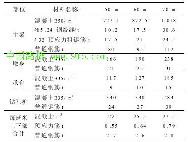 在引桥设计中,分别对50,60,70m三种跨径的混凝土连续梁作了全面比较,见表1。换算每延米工程材料用量进行比较并考虑施工难易程度,60m梁跨比较合适,因此本桥引桥跨径确定为60m。