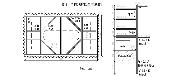 在钢板桩施工完成、封底以后,就开始支撑的施工。在施工支撑及承台的过程中,应对支撑系统进行监测。主要监测支撑的变形、钢板桩的变形、基坑内流动水量及围堰的位移等。在施工过程中可能出现如下的情况: