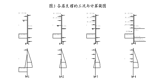 支撑结构的内力计算:在支撑结构的土压力、支撑力和钢板桩的插入深度确定后,即可根据静力平衡条件确定任意截面上的支撑结构所受的弯矩。
