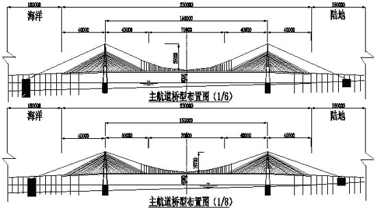 ⑵悬索:采用1/6和1/8两种垂跨比分别计算作对比, 显然前者的水平拉力小88516KN, 采用复合钢管砼增加塔高好解决,对于锚碇施工条件困难的意义重大。