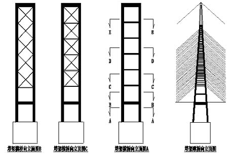 预应力,以平衡两边斜拉索的水平分力。刚架的复合钢管砼水平横撑仅设中部,以便斜拉索张拉锚固,两侧空间留作升、降通道,同样起到箱形塔柱的作用。塔架的稳定和抗弯、扭刚度都大,也能提高面梁的抗弯刚度。斜拉索和悬索索面布置呈外张形式,对桥面横向稳定有利。塔架横桥方向的立面形式为“门”字形刚架或钢管桁架,横向联接都设在塔柱上,空间抗扭刚度较大。塔柱的横向宽度和刚度很大,抗风稳定性好,采用复合钢管砼和钢管砼骨架施工都较方便。斜张桥对塔架具有平衡稳定的作用,塔架虽然很高,但是稳定性能很好。