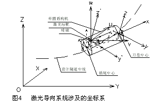 从盾构施工基本过程(图3)可以看出,激光导向系统不能够独立完成导向任务,在盾构机始发、该系统启用之前,还需要做一些辅助工作:首先,激光全站仪首次设站点及其定向点坐标,需用人工测定。其次必须使用人工测量的方法,对盾构机姿态初值进行精确测定,以便于对激光导向系统中有关初始参数(如激光标靶上棱镜的坐标,内部的光栅初始位置及两竖角测量仪初值等)进行配置。 盾构机姿态是指盾构机前端刀盘中心(以下简称“刀头”)三维坐标和盾构机筒体中心轴线在三个相互垂直平面内的转角等参数。盾构机姿态除了可以通过人工测量、单独解算方式获得外,还可以由导向系统实时、自动地获取。用人工测量方式获得盾构机姿态的过程,被称作“盾构机控制测量”。盾构机控制测量的另一个作用是:在盾构机掘进过程的间隙,对激光导向系统采集的盾构机姿态参数进行检核,对激光导向系统中有关配置参数进行校正。3 盾构机激光导向系统原理:3.1盾构机激光导向系统涉及的坐标系 为了阐明激光导向系统的原理,首先介绍一些与盾构机及隧道有关的坐标系(见图4): (1) 地面直角坐标系(O-XYZ):简称地面坐标系,根据隧道中线设计而定,一般为地方坐标系。洞内(外)控制点、测站点、后视点以及隧道中线坐标,均用该系坐标表示。 (2) 盾构机坐标系(F-xyz):在盾构机水平放置且未发生旋转的情况下,以盾构机刀头中心前端切点为原点,以盾构机中心纵轴为x轴,由盾尾指向刀头为正向;以竖直向上的方向线为z轴, y轴沿水平方向与x、z轴构成左手系。盾构机坐标系是连同盾构机一起运动的独立直角坐标系。盾构机尾部中心参考点、盾构机棱镜等相对盾构机的位置都以此系坐标表示,这些坐标由盾构机制造商测定并给出 。 (3) 棱镜中心坐标系(P-x’y’z’): 原点为安装在盾构机尾部的棱镜的中心,与盾构机坐标系平行。 除此之外,为了解算还引入了其他一些空间辅助坐标系,从略。