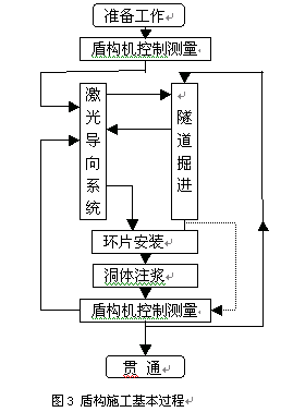 2 激光导向系统和盾构机控制测量在盾构施工中的地位和作用 地铁盾构法施工过程如图3所示。在隧道掘进模式下,激光导向系统是实时动态监测和调整盾构机的掘进状态,保持盾构机沿设计隧道轴线前进的工具之一。在整个盾构施工过程中,激光导向系统起着极其重要的作用:(1)在显示面板上动态显示盾构机轴线相对于隧道设计轴线的准确位置,报告掘进状态(见图2);并在一定模式下,自动调整或指导操作者人工调整盾构机掘进的姿态,使盾构机沿接近隧道设计轴线掘进。