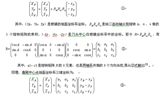 3.3.2刀头、盾尾中心的地面坐标系三维坐标解算: 1)将盾构机坐标转化为棱镜中心坐标: 设刀头中心F、盾尾中心B及棱镜中心在盾构机坐标系 中的坐标分别为(0,0,0)(xB,yB,zB)和(xP,yP,zP)则三点在棱镜坐标系中的坐标为(-xP, -yP, -zP)、(xB -xP, yB -yP, zB -zP)和(0,0,0)。 2)刀头、盾尾中心地面坐标解算:刀头中心在地面坐标系中的三维坐标为