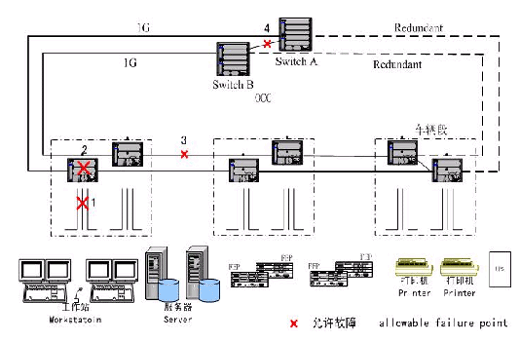③ 采用双环网冗余和环间冗余。环间冗余(下联冗余),即可以在两个环网在中央建立两条互为热备的连接通道,当其中一条发生故障时可以自动切换到另外一条通道,为系统的扩展提供了很大的方便。