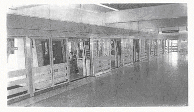 从目前各国设置的屏蔽门系统来看,主要有两种类型。第一类屏蔽门是一道自上而下的玻璃隔墙和活动门,沿着车站站台边缘和两端头设置,把站台乘客候车区与列车进站停靠区域分隔开(见图1) 。这种屏蔽门系统的主要功能是增加安全性、节约能耗以及加强环境保护。