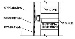 (3) 在顶板与侧墙的施工缝处,侧墙与底板的施工缝处,初衬与二衬之间同时设置纵向排水塑料盲管。